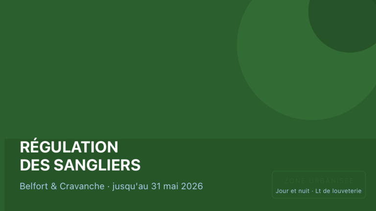 ARRÊTÉ PRÉFECTORAL — RÉGULATION DES SANGLIERS Communes concernées Belfort et Cravanche Zone d’intervention Y compris en zone urbanisée Période Jusqu’au 31 mai 2026 Horaires De jour comme de nuit Encadrement Lieutenant de louveterie — suivi régulier par les services compétents…