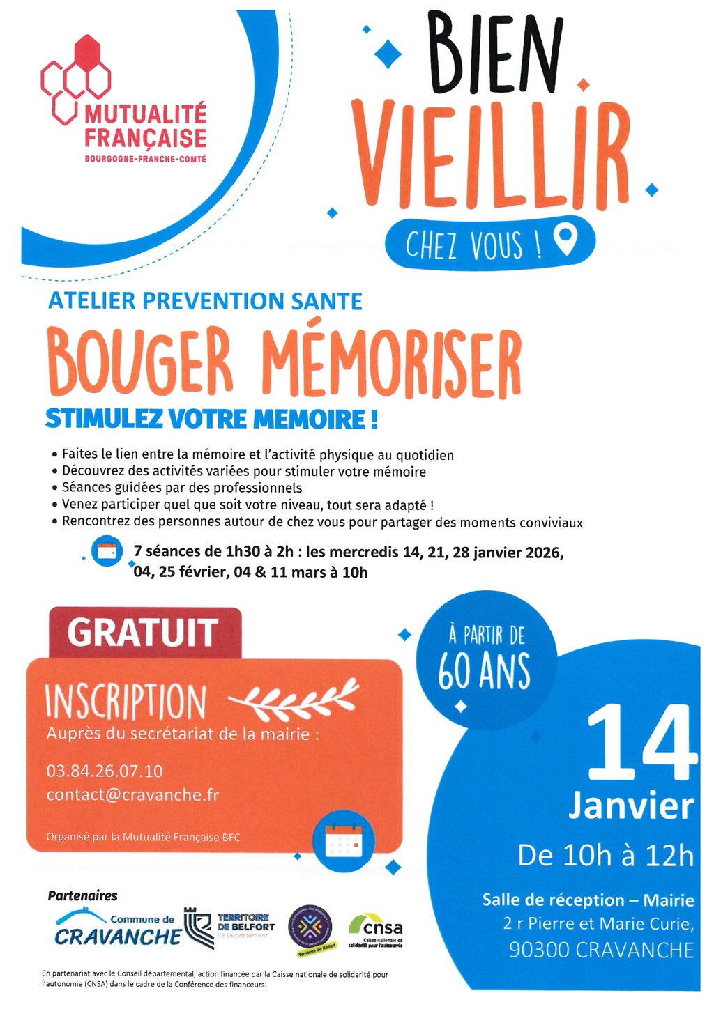 La Mutualité Française, en partenariat avec la Commune de Cravanche, le Département du Territoire de Belfort et la CNSA, organise un Atelier Prévention Santé « Bouger Mémoriser » dont la 1ère séance aura lieu le Mercredi 14 janvier 2026