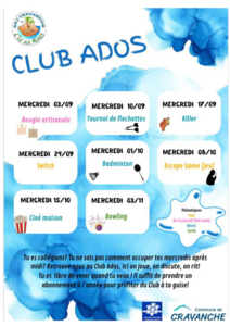 Animé par Clémentine, ce club programme également des sorties variées : vélo, cinéma et stages sportifs. Renseignements, tarifs et inscriptions : Sej@cravanche.fr ou 06.76.90.81.10